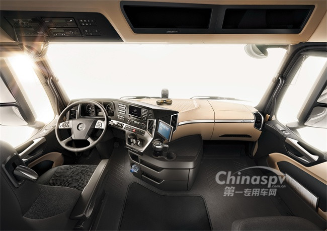 在22種可選擇的駕駛室設(shè)計(jì)中,針對(duì)中國市場的新Actros專門配置了頂部流線型的平地板駕駛室——在保證超大內(nèi)部空間的前提下,整體的流線造型和全系標(biāo)配的導(dǎo)流罩將風(fēng)阻系數(shù)降至最低。車頭采用孔狀散熱器隔柵,左側(cè)帶有醒目Actros標(biāo)志以及平滑后視鏡殼體。為給長途運(yùn)輸駕駛員帶來舒心的辦公室和移動(dòng)之家,新Actros駕駛室內(nèi)采用全新顏色方案和幾何設(shè)計(jì)來區(qū)分工作區(qū)和起居區(qū)。多功能方向盤、更符合人體工程學(xué)的懷抱式儀表盤保證了操控的簡便,各種開關(guān)觸手可及,讓駕駛員的工作更輕松。多達(dá)14個(gè)方向和角度可調(diào)節(jié)的寬大座椅及新增加的背部側(cè)翼支撐、腰部雙氣囊支撐,能讓長期奔波的駕駛員找到最佳狀態(tài)。駕駛員頭部和臥鋪下方配置了巨大的儲(chǔ)物空間,拿取物品更方便;減振臥鋪的一側(cè)可以按不同角度抬升,讓駕駛員在休憩時(shí)得到最好的放松。得益于駕駛室密封性的改進(jìn),新Actros駕駛室的內(nèi)部噪音明顯降低。