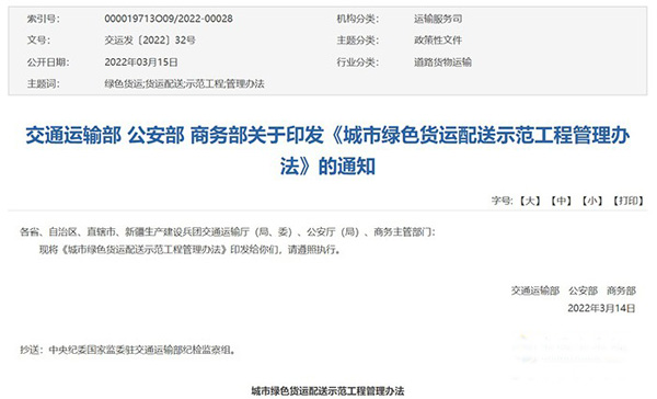 2022年3月15日,交通運(yùn)輸部、公安部以及商務(wù)部聯(lián)合印發(fā)了《城市綠色貨運(yùn)配送示范工程管理辦法》。制定該辦法,是為了加快推動城市貨運(yùn)配送體系綠色低碳發(fā)展,進(jìn)一步加強(qiáng)城市綠色貨運(yùn)配送示范工程管理工作規(guī)范化、制度化,保障示范工程建設(shè)有力有序推進(jìn),不斷提升城市綠色貨運(yùn)配送發(fā)展水平,更好服務(wù)加快建設(shè)交通強(qiáng)國等國家戰(zhàn)略實(shí)施。