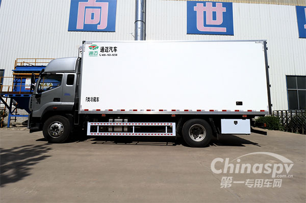 胡守鵬透露,通邁冷藏車芯層為聚氨酯泡沫板保溫材料,聚氨酯板之間為玻璃鋼加強筋,聚氨酯泡沫板導熱系數小于0.021W/MK,箱體總傳熱系數小于0.4W/MK,廂體無金屬冷橋,導熱率低,保溫性能優(yōu)良。板塊粘接用高強度、高密封性膠合劑,形成一個整體,耐腐蝕性好。廂體采用高分子聚酯材料熱壓成型,獨特的全封閉結構,可能耐一般濃度的酸堿鹽大部分有機溶劑、海水、油類的腐蝕,廂式使用時間更長。外飾件采用304食品級不銹鋼外制件和鋁制件,經久耐用。一體化的內部加強筋,極大的增加了廂板強度。