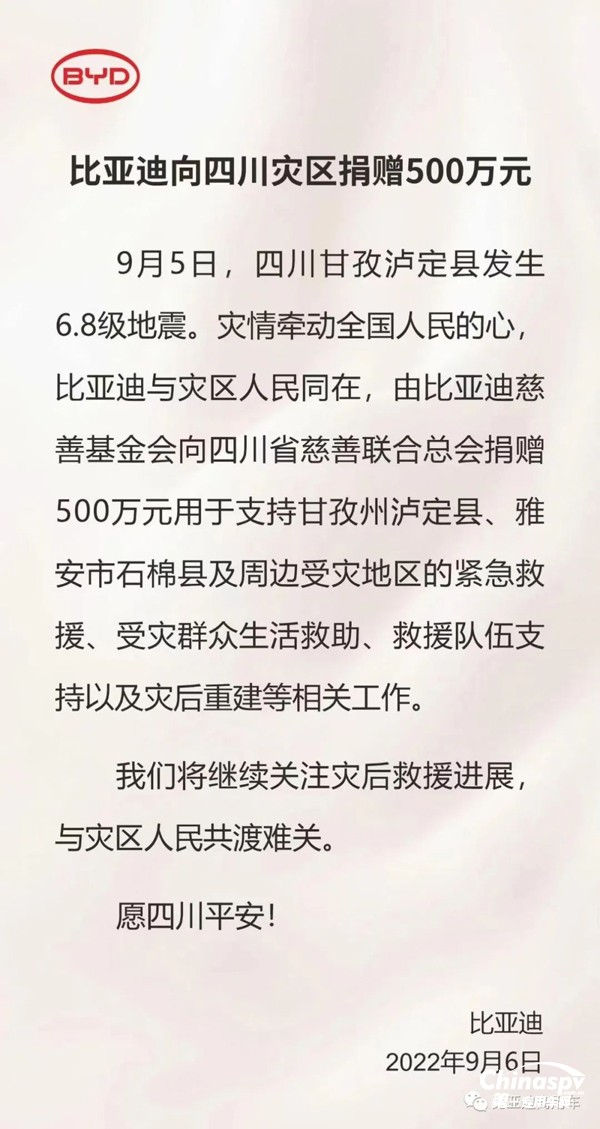 一方有難,八方支援。2022年9月5日,比亞迪向四川災(zāi)區(qū)捐贈(zèng)500萬元,與災(zāi)區(qū)人民共渡難關(guān),愿四川平安。