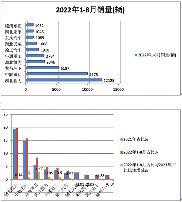 根據(jù)終端上牌信息,2022年8月環(huán)衛(wèi)車銷量8898輛,同比(去年8月銷量7489輛,見截圖1)增18.8%,2022年1-8月環(huán)衛(wèi)車?yán)塾?jì)銷售61864輛,同比(2021年1-8月累計(jì)銷售70828輛,見截圖1)下降12.65%。
