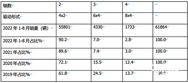 ---4軸車(8X4類)累計(jì)銷量為1733輛,占比2.8%,且占比比2021年減少0.2個(gè)百分點(diǎn),比2020年和2019年占比減少更多。