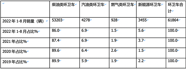 上圖表可見,按動(dòng)力燃料種類劃分,在2022年1-8月環(huán)衛(wèi)車銷量結(jié)構(gòu)中: