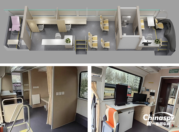 車(chē)內(nèi)功能齊全,采用DR+心電+ B超+婦科+化驗(yàn)區(qū)的布局,配備X線(xiàn)機(jī)、DR設(shè)備、電離室、信息識(shí)別、醫(yī)用顯示器等先進(jìn)儀器設(shè)備,同時(shí)鉛房為6面防護(hù),高于GBZ130-2020放射診斷放射防護(hù)要求。車(chē)內(nèi)的工作臺(tái)均為圓角,有效防止碰傷。