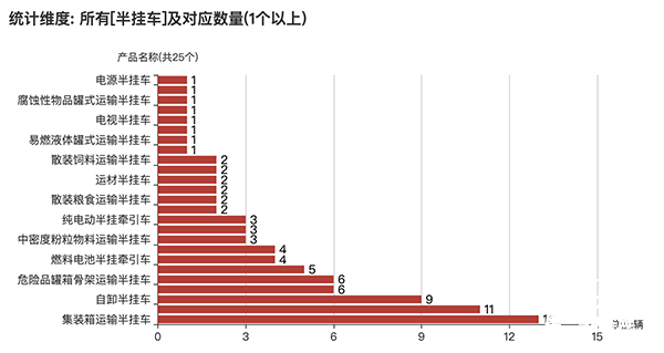 本次公告中的87款半掛車共包含25種車型,集裝箱運(yùn)輸半掛車(13輛)、倉(cāng)柵式運(yùn)輸半掛車(11輛)、自卸半掛車(9輛)、平板運(yùn)輸半掛車(6輛)、危險(xiǎn)品罐箱骨架運(yùn)輸半掛車(6輛)、廂式運(yùn)輸半掛車(5輛)、燃料電池半掛牽引車(4輛)、普通液體運(yùn)輸半掛車(4輛)、中密度粉粒物料運(yùn)輸半掛車(3輛)、低平板半掛車(3輛)、純電動(dòng)半掛牽引車(3輛)、鋁合金集裝箱運(yùn)輸半掛車(2輛)、散裝糧食運(yùn)輸半掛車(2輛)、翼開啟廂式半掛車(2輛)、運(yùn)材半掛車(2輛)、換電式純電動(dòng)半掛牽引車(2輛)、散裝飼料運(yùn)輸半掛車(2輛)、空載集裝箱運(yùn)輸半掛車(1輛)、易燃液體罐式運(yùn)輸半掛車(1輛)、危險(xiǎn)品半掛牽引車(1輛)、電視半掛車(1輛)、半掛牽引車(1輛)、腐蝕性物品罐式運(yùn)輸半掛車(1輛)、計(jì)量檢衡半掛車(1輛)、電源半掛車(1輛)。