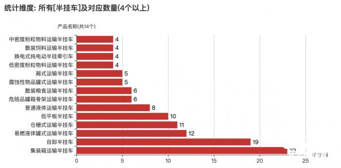 本次公告中的157款半掛車共包含38種車型,集裝箱運(yùn)輸半掛車(23輛)、自卸半掛車(19輛)、易燃液體罐式運(yùn)輸半掛車(12輛)、倉(cāng)柵式運(yùn)輸半掛車(11輛)、低平板半掛車(10輛)、普通液體運(yùn)輸半掛車(8輛)、危險(xiǎn)品罐箱骨架運(yùn)輸半掛車(6輛)、散裝糧食運(yùn)輸半掛車(6輛)、腐蝕性物品罐式運(yùn)輸半掛車(5輛)、廂式運(yùn)輸半掛車(5輛)、換電式純電動(dòng)半掛牽引車(4輛)、散裝飼料運(yùn)輸半掛車(4輛)、低密度粉粒物料運(yùn)輸半掛車(4輛)、中密度粉粒物料運(yùn)輸半掛車(4輛)、燃料電池半掛牽引車(3輛)、純電動(dòng)半掛牽引車(3輛)、平板運(yùn)輸半掛車(3輛)、半掛牽引車(3輛)、半掛牽引汽車(2輛)、液態(tài)食品運(yùn)輸半掛車(2輛)、液化氣體運(yùn)輸半掛車(2輛)、通信半掛車(2輛)、毒性和感染性物品罐式運(yùn)輸半掛車(1輛)、鋁合金運(yùn)油半掛車(1輛)、垃圾轉(zhuǎn)運(yùn)半掛車(1輛)、污水處理半掛車(1輛)、舞臺(tái)半掛車(1輛)、運(yùn)油半掛車(1輛)、乘用車輛運(yùn)輸半掛車(1輛)、壓縮式垃圾半掛車(1輛)、鋁合金易燃液體罐式運(yùn)輸半掛車(1輛)、吸污半掛車(1輛)、低溫液體運(yùn)輸半掛車(1輛)、氧化性物品罐式運(yùn)輸半掛車(1輛)、運(yùn)材半掛車(1輛)、危險(xiǎn)品運(yùn)輸半掛牽引車(1輛)、混凝土攪拌運(yùn)輸半掛車(1輛)、物料粉碎半掛車(1輛)。![]()