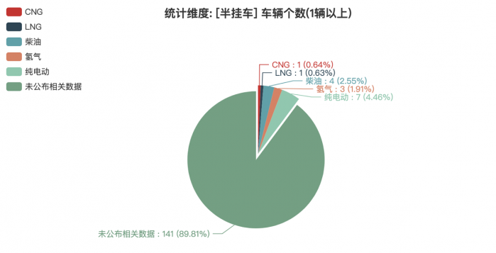 本次公告中的157款半掛車中,CNG(1輛,占比0.64%)、LNG(1輛,占比0.64%)、柴油(4輛,占比2.55%)、氫氣(3輛,占比1.91%)、純電動(dòng)(7輛,占比4.46%)、未公布相關(guān)數(shù)據(jù)(141輛,占比89.81%)。![]()