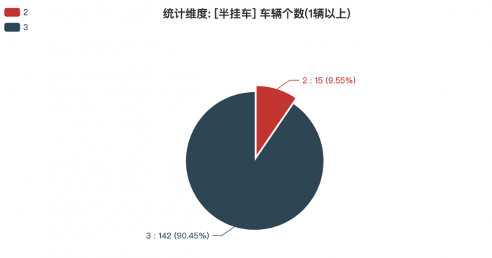 本次公告中的157款半掛車中,2軸(15輛,占比9.55%)、3軸(142輛,占比90.45%)。![]()