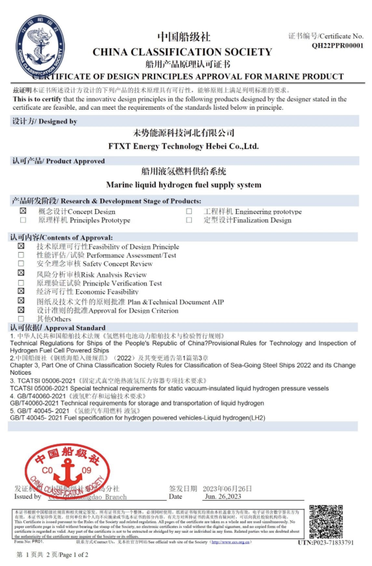國內(nèi)首張!未勢能源船用液氫供給系統(tǒng)獲得中國船級社CCS認(rèn)證