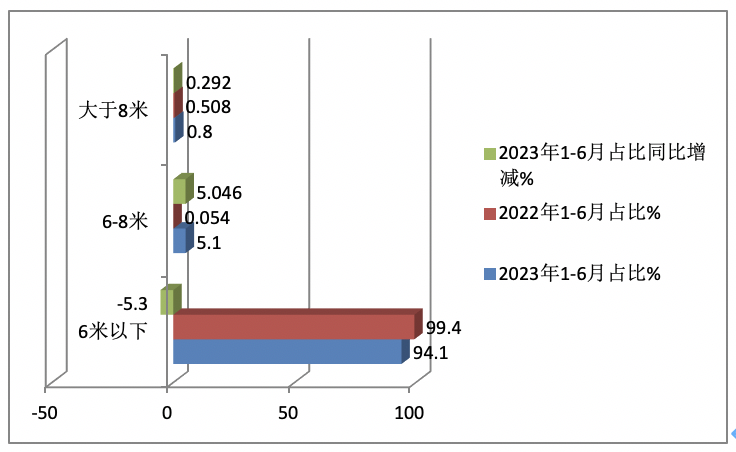 ----2023年1-6月8米段以上房車(chē)?yán)塾?jì)銷(xiāo)售62輛,市場(chǎng)占比為0.8%,居最小,占比同比增加0.292個(gè)百分點(diǎn),是占比同比增加第二多的細(xì)分車(chē)型。