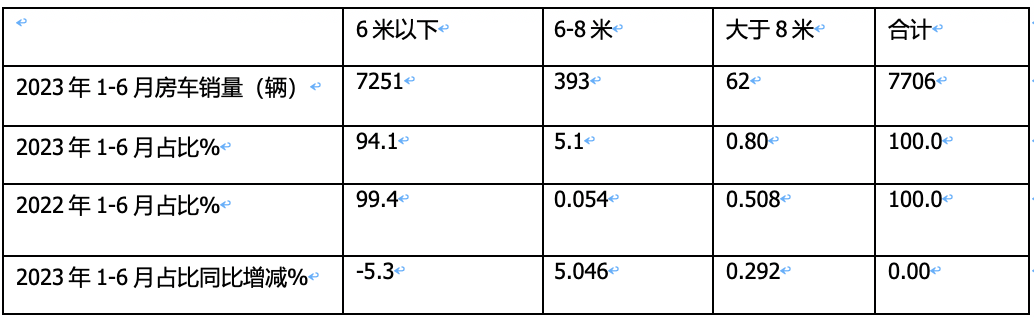 表4,按車(chē)型長(zhǎng)度段劃分,2023年1-6月與2022年同期房車(chē)市場(chǎng)銷(xiāo)量及占比同比增減統(tǒng)計(jì)(數(shù)據(jù)來(lái)源:終端上牌信息)