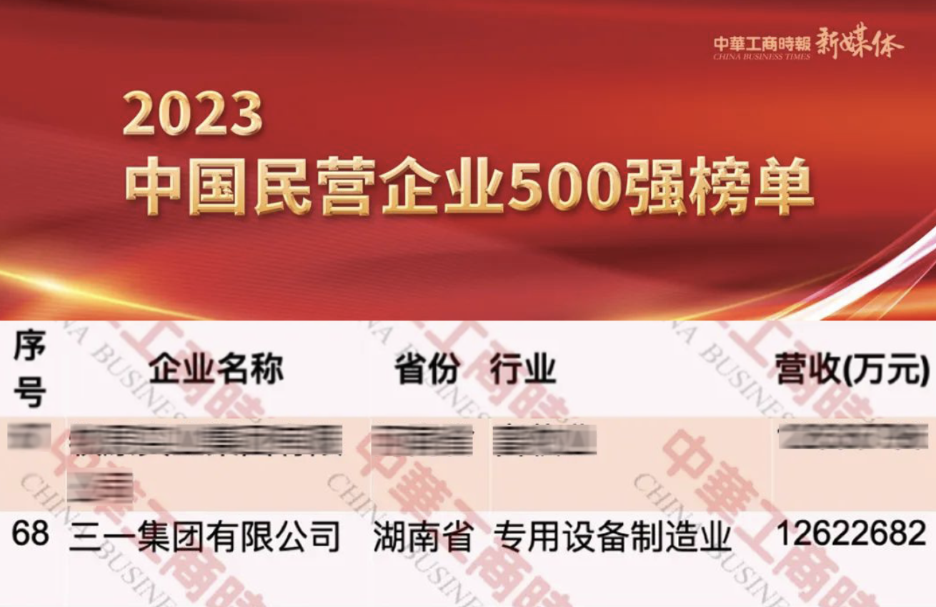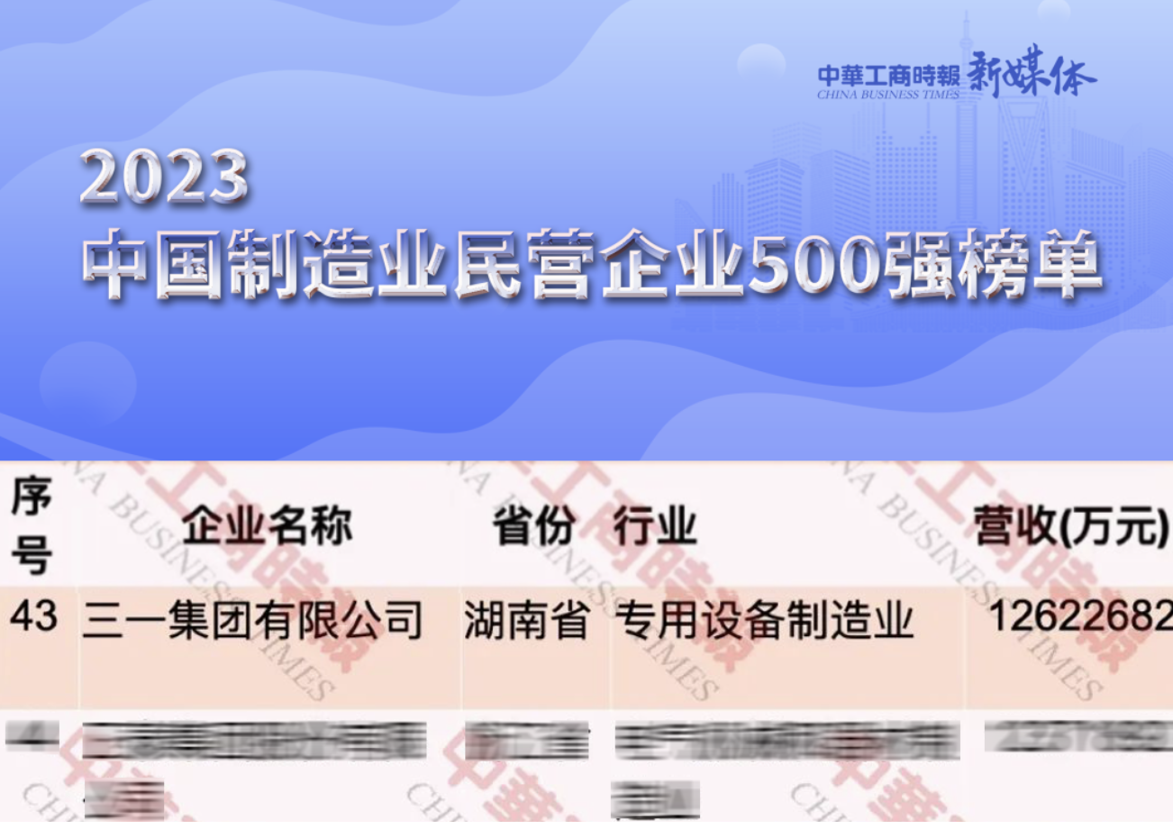2023年9月12日,全國工商聯(lián)發(fā)布“2023中國民營企業(yè)500強”和“2023中國制造業(yè)民營企業(yè)500強”榜單,三一集團榜上有名,蟬聯(lián)工程機械行業(yè)“雙料冠軍”。