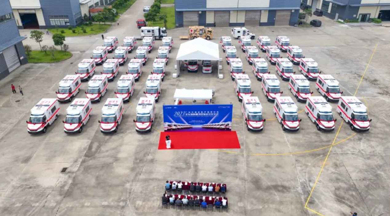 2023年9月12日,珠海舉行了41輛進口依維柯底盤鵬宇高性能方艙監(jiān)護型負(fù)壓救護車的現(xiàn)場交付儀式。