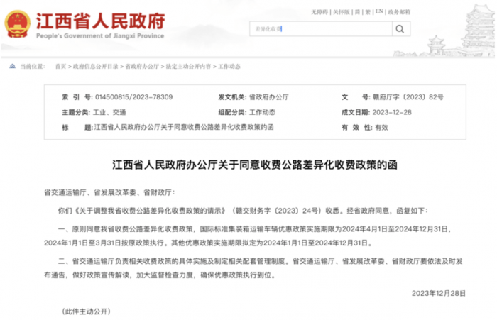 近日,江西省人民政府批復(fù)了《關(guān)于調(diào)整我省收費(fèi)公路差異化收費(fèi)政策的請(qǐng)示》。原則同意江西省收費(fèi)公路差異化收費(fèi)政策,國(guó)際標(biāo)準(zhǔn)集裝箱運(yùn)輸車(chē)輛優(yōu)惠政策實(shí)施期限為2024年4月1日至2024年12月31日,2024年1月1日至3月31日按原政策執(zhí)行。![]()