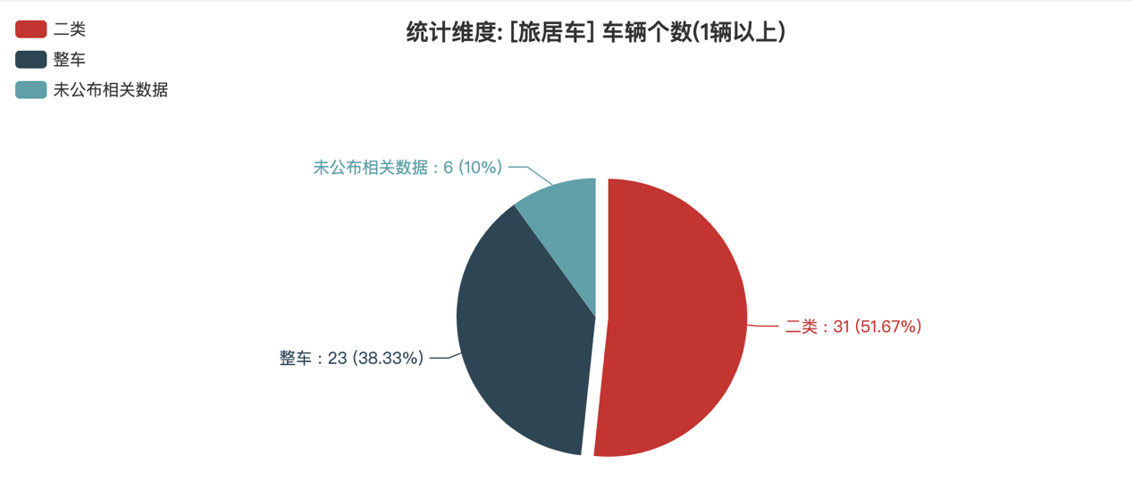 本次公告中的60款旅居車中,二類(31輛,占比51.67%)、整車(23輛,占比38.33%)、未公布相關數(shù)據(6輛,占比10%)。