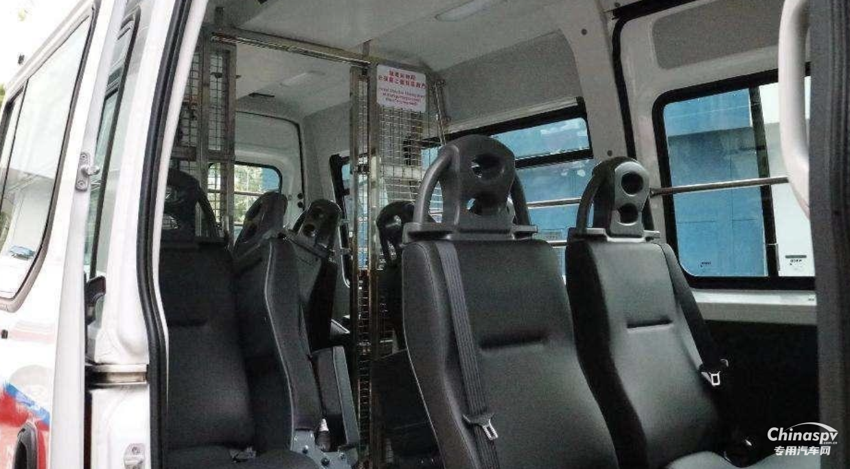 車內(nèi)空間設計的十分寬敞,連同前排至少可以容納10名警務人員。車內(nèi)設計主要以使用便利為主,安裝了8個儲物箱,并且有折疊的物品架,拉開可以用來放置平板電腦。