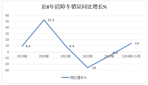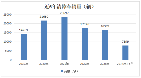 根據(jù)公開信息,2019年—2021年清障車銷量同比均為正增長,2022年銷量相對(duì)2021年則出現(xiàn)下滑,2023年同比繼續(xù)下滑,2024年1-5月則出現(xiàn)同比14%的增長。