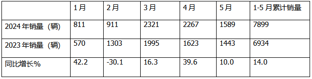 表1,根據(jù)終端上牌數(shù)據(jù),2024年1-5月各月清障車銷量及同比: