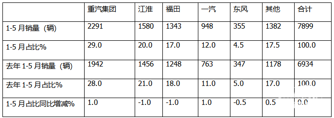 按底盤企業(yè)劃分,今年1-5月搭載重汽底盤的清障車?yán)塾?jì)銷量2291輛,占比近3成(29%),居榜首;居第二的是搭載江淮汽車底盤的清障車?yán)塾?jì)銷售1580輛,占比2成(20%);居第三的是搭載福田底盤的清障車?yán)塾?jì)銷售1343輛,占比17%;