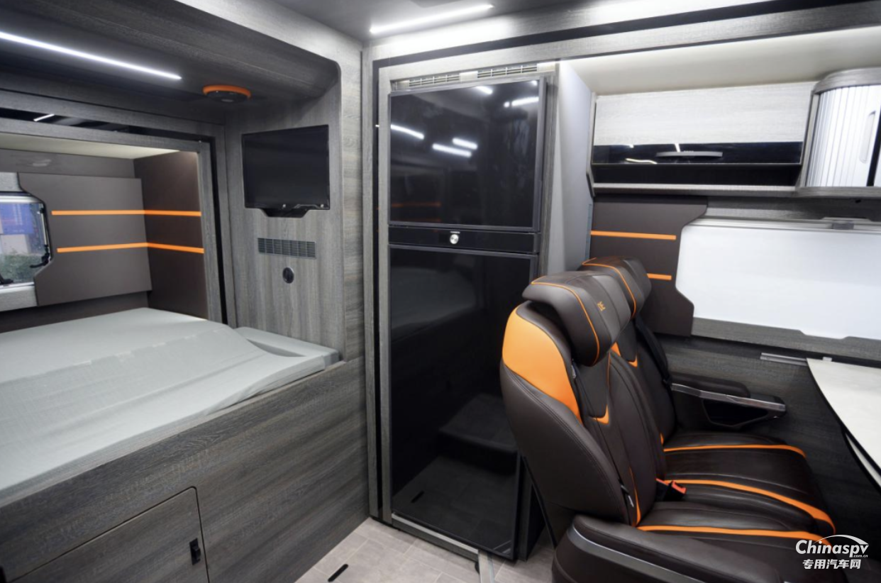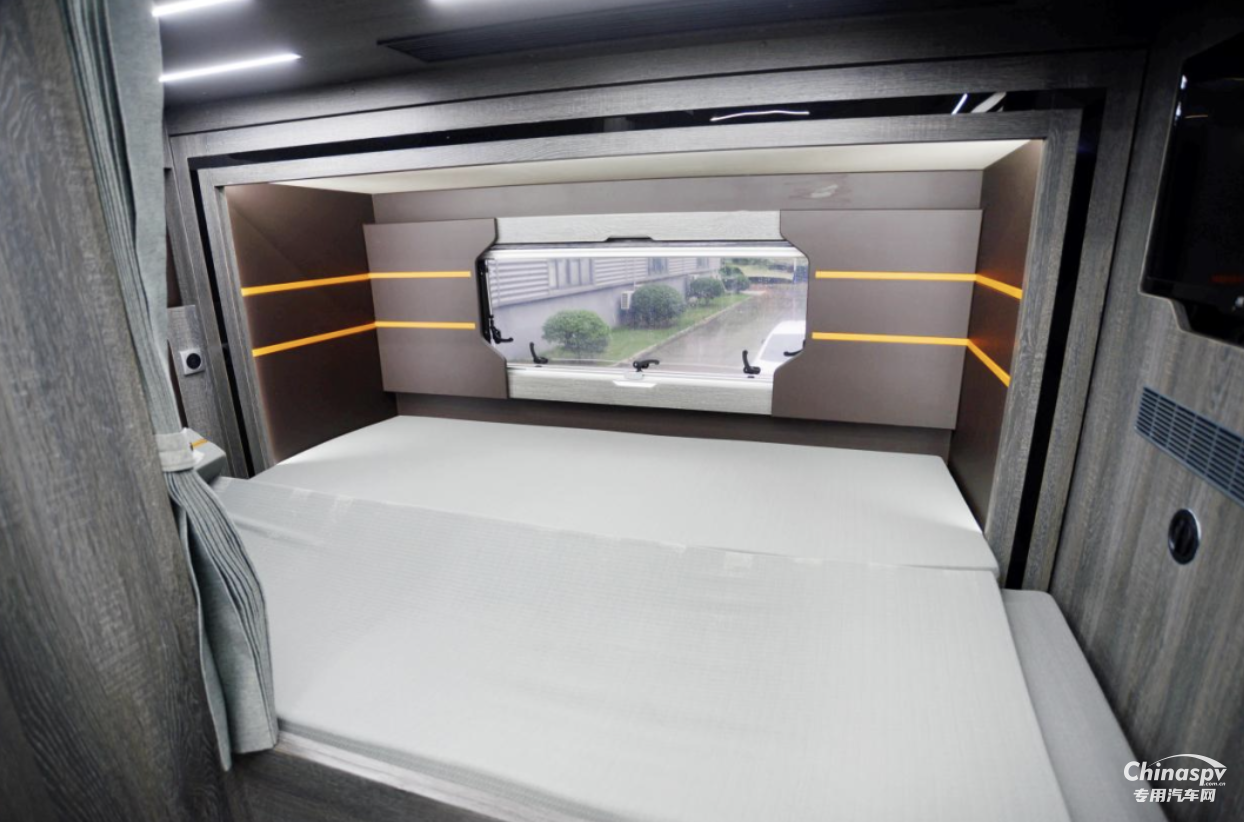 車尾為固定橫床布局,拓展展開后整個(gè)區(qū)域可以供兩人睡臥使用,床鋪標(biāo)配有慢回彈海綿床墊,保障了用戶睡臥的舒適。床鋪前方配有一臺(tái)電視機(jī),內(nèi)側(cè)設(shè)計(jì)有電源接口、閱讀燈、置物格等設(shè)施,豐富的便利性設(shè)施帶來更優(yōu)的旅居體驗(yàn)。