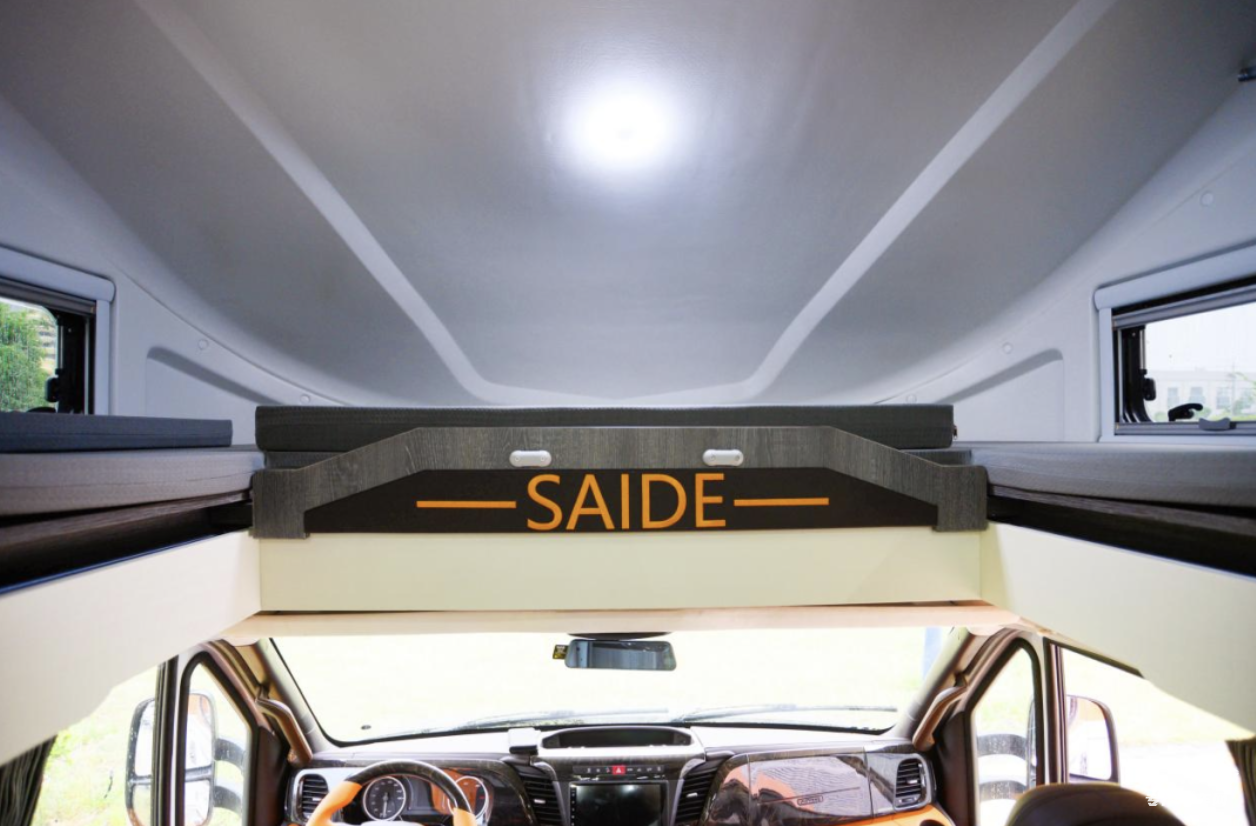 駕駛艙上方的額頭床為抽拉式設(shè)計(jì),拉開下方的抽拉板,鋪上標(biāo)配的慢回彈海綿墊即可舒適睡臥。額頭兩側(cè)設(shè)計(jì)有兩扇外推窗,豐富了車內(nèi)的自然采光。