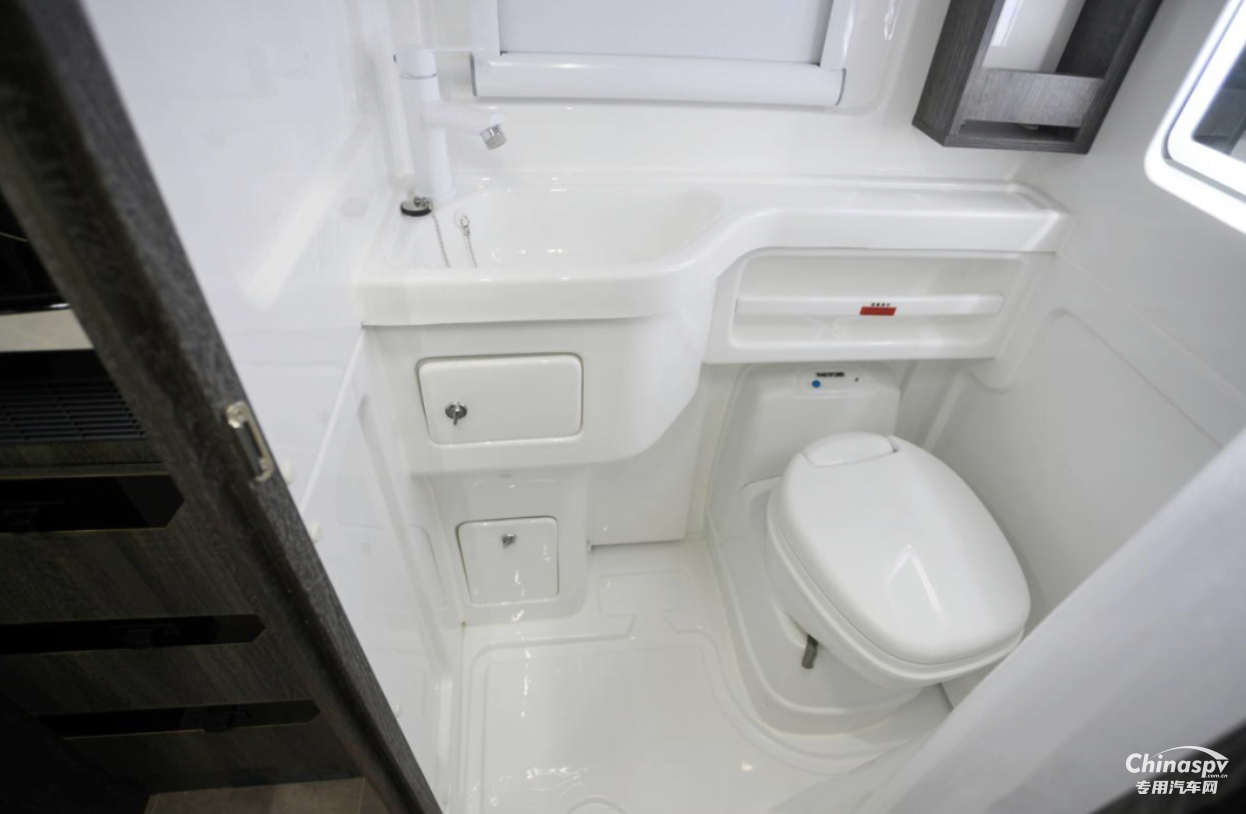 衛(wèi)浴間為吸塑一體式設(shè)計(jì),內(nèi)部配備有除霧鏡、賽特福德坐便器、換氣扇等,衛(wèi)浴設(shè)施齊全,保障了用戶旅居淋浴洗漱等需求。考慮到旅居時(shí)衣物清潔問題,賽德在車廂內(nèi)部為用戶配備了一臺(tái)大宇3kg洗烘一體機(jī),清洗衣物更加方便。