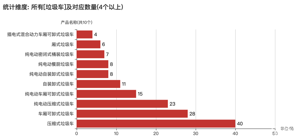 本次公告中的165款垃圾車的車型共有21種,壓縮式垃圾車(40輛)、車廂可卸式垃圾車(28輛)、純電動(dòng)壓縮式垃圾車(23輛)、純電動(dòng)車廂可卸式垃圾車(15輛)、自裝卸式垃圾車(11輛)、純電動(dòng)自裝卸式垃圾車(8輛)、純電動(dòng)餐廚垃圾車(8輛)、純電動(dòng)密閉式桶裝垃圾車(7輛)、廂式垃圾車(6輛)、插電式混合動(dòng)力車廂可卸式垃圾車(4輛)、餐廚垃圾車(2輛)、純電動(dòng)自卸式垃圾車(2輛)、插電式混合動(dòng)力壓縮式垃圾車(2輛)、垃圾轉(zhuǎn)運(yùn)半掛車(2輛)、換電式純電動(dòng)車廂可卸式垃圾車(1輛)、自卸式垃圾車(1輛)、純電動(dòng)垃圾轉(zhuǎn)運(yùn)車(1輛)、換電式純電動(dòng)自卸式垃圾車(1輛)、純電動(dòng)桶裝垃圾運(yùn)輸車(1輛)、純電動(dòng)分撿垃圾運(yùn)輸車(1輛)、純電動(dòng)廂式垃圾車(1輛)。