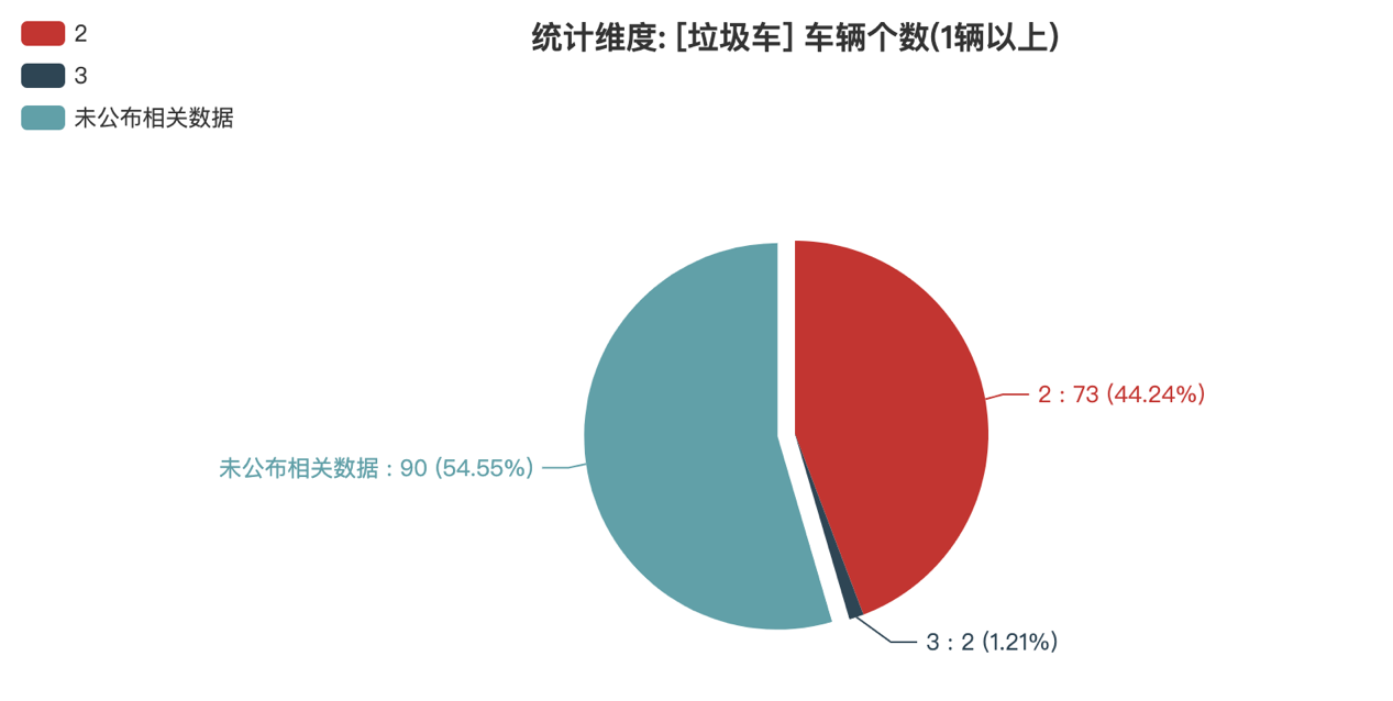 本次公告中的165款垃圾車中,2軸(73輛,占比44.24%)、3軸(2輛,占比1.21%)、未公布相關(guān)數(shù)據(jù)(90輛,占比54.55%)。