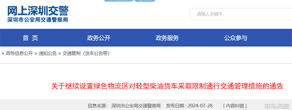 2024年7月28日,深圳市公安局交通警察局發(fā)布了關(guān)于繼續(xù)設(shè)置綠色物流區(qū)對輕型柴油貨車采取限制通行交通管理措施的通告。通告指出:自2024年7月29日至2025年7月28日,每天0時(shí)至24時(shí),禁止輕型柴油貨車駛?cè)?ldquo;綠色物流區(qū)”。凡違反本通告規(guī)定的,將依照道路交通管理法律法規(guī)和相關(guān)規(guī)定予以處罰。