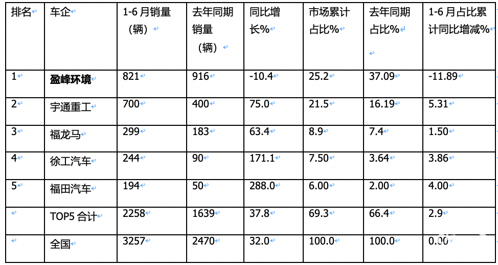 在今年前6月新能源環(huán)衛(wèi)車市場競爭格局中,盈峰環(huán)境領跑,但占比同比市場份額減少最多;宇通占比同比增加5.31個百分點,是占比同比增加最多的車企,表現(xiàn)搶眼。