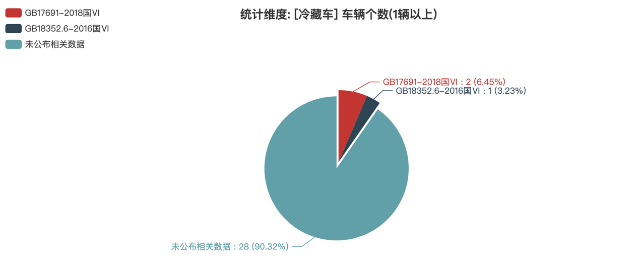 本次公告中的31款冷藏車中,排放標(biāo)準(zhǔn)情況如下:GB17691-2018國Ⅵ(2輛,占比6.45%)、GB18352.6-2016國Ⅵ(1輛,占比3.23%)、未公布相關(guān)數(shù)據(jù)(28輛,占比90.32%)。