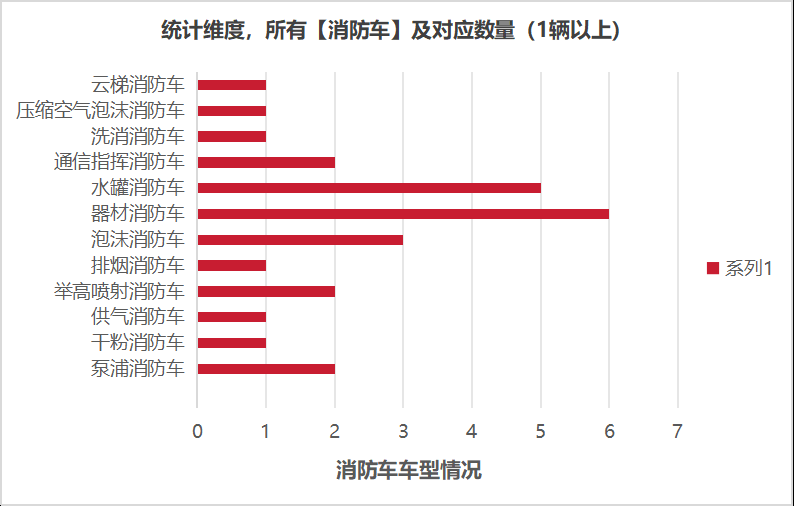 本次公告中的26款消防車的車型共有12種,泵浦消防車(2輛)、干粉消防車(1輛)、供氣消防車(1輛)、舉高噴射消防車(2輛)、排煙消防車(1輛)、泡沫消防車(3輛)、器材消防車(6輛)、水罐消防車(5輛)、通信指揮消防車(2輛)、洗消消防車(1輛)、壓縮空氣泡沫消防車(1輛)、云梯消防車(1輛)。