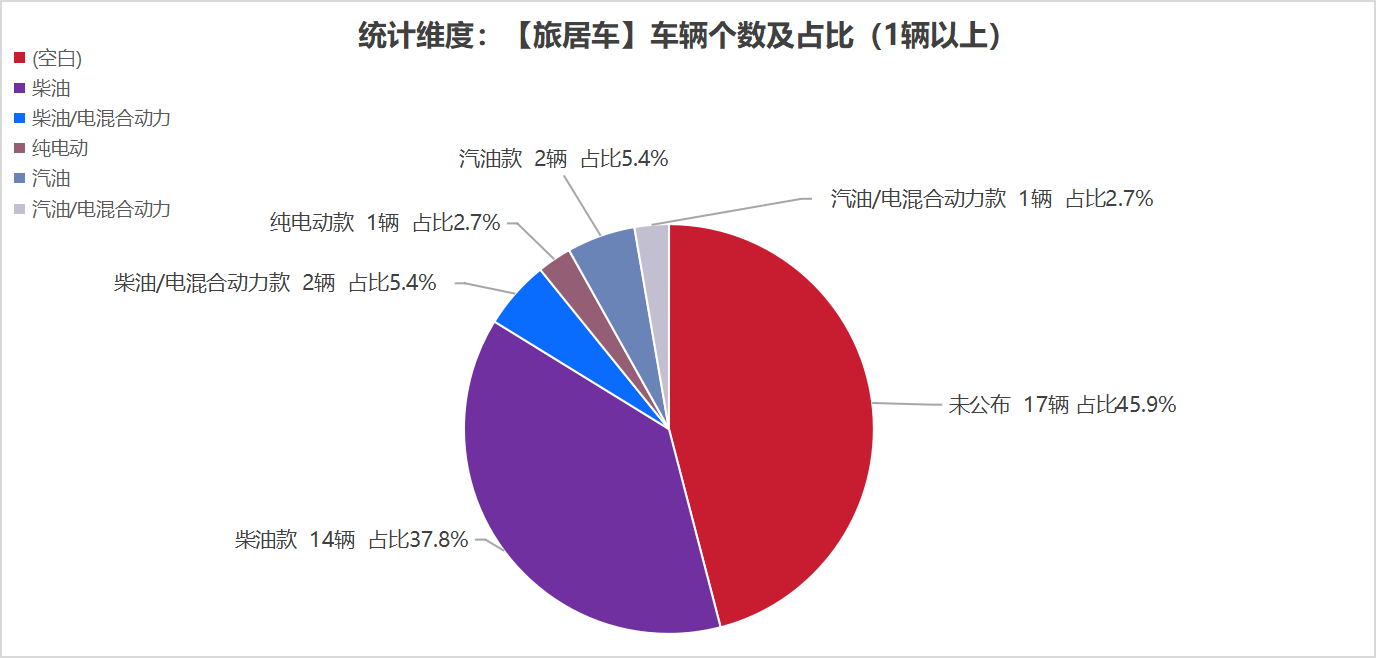 本次公告中的37款旅居車中,柴油(14輛,占比37.8%)、汽油(2輛,占比5.4%)、汽油/電混合動(dòng)力(1輛,占比2.7%)、柴油/電混合動(dòng)力(2輛,占比5.4%)、純電動(dòng)(1輛,占比2.7%)未公布相關(guān)數(shù)據(jù)(17輛,占比45.9%)。