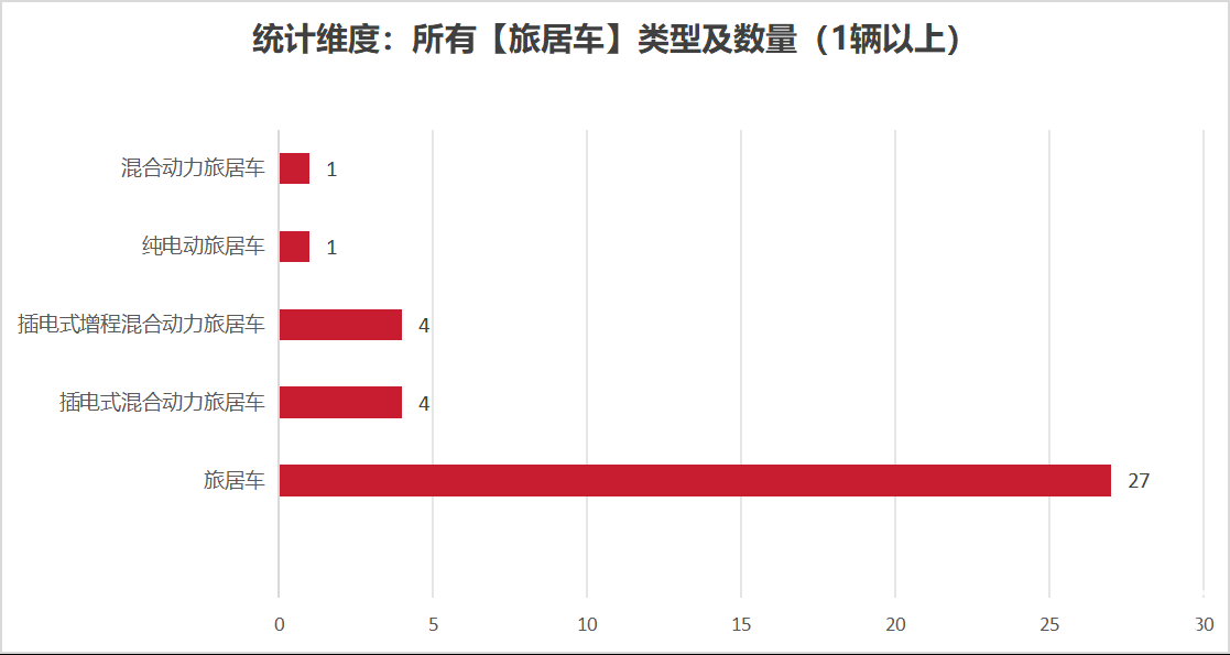 本次公告中的37款旅居車的車型共有5種,旅居車(27輛)、插電式混合動(dòng)力旅居車(4輛)、插電式增程混合動(dòng)力旅居車(4輛)、純電動(dòng)旅居車(1輛)、混合動(dòng)力旅居車(1輛)。