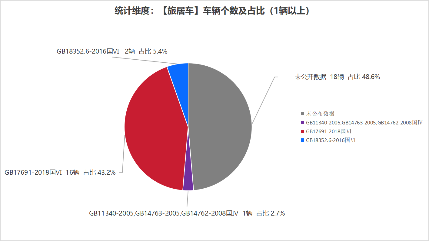 本次公告中的37款旅居車中,GB11340-2005,GB14763-2005,GB14762-2008國(guó)Ⅳ(1輛,占比2.7%)、GB17691-2018國(guó)Ⅵ(16輛,占比43.2%)、GB18352.6-2016國(guó)Ⅵ(2輛,占比5.4%)、未公布相關(guān)數(shù)據(jù)(18輛,占比48.6%)。