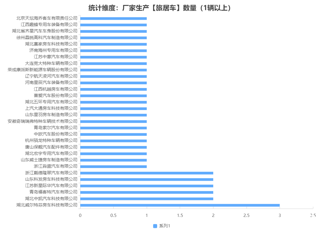 本次公告中的37款旅居車的生產(chǎn)企業(yè)共有30家,湖北威爾特芬房車科技有限公司(3輛)、湖北中凱汽車科技有限公司(2輛)、青島福客特汽車有限公司(2輛)、江蘇新星際華汽車有限公司(2輛)、山東科發(fā)房車科技有限公司(2輛)、浙江戴德隆翠汽車有限公司(2輛)、浙江淼盛汽車有限公司(1輛)、山東威士捷房車制造有限公司(1輛)、湖北宏宇專用汽車有限公司(1輛)、唐山保靚汽車配件有限公司(1輛)、杭州驍龍?zhí)胤N車輛有限公司(1輛)、中歐汽車股份有限公司(1輛)、青島索爾汽車有限公司(1輛)、安徽奇瑞瑞弗特種車輛技術(shù)有限公司(1輛)、山東星羽房車制造有限公司(1輛)、上汽大通房車科技有限公司(1輛)、湖北五環(huán)專用汽車有限公司(1輛)、喜愛(ài)汽車股份有限公司(1輛)、江西杭越房車有限公司(1輛)、河南星辰汽車裝備有限公司(1輛)、遼寧航天凌河汽車有限公司(1輛)、榮成康派斯新能源車輛股份有限公司(1輛)大連寬大特種車輛有限公司(1輛)、江蘇中意汽車有限公司(1輛)、濟(jì)南海州專用車有限公司(1輛)、湖北賽家房車科技有限公司(1輛)、徐州晶銳高科汽車制造有限公司(1輛)、湖北省齊星汽車車身股份有限公司(1輛)、江西趣蜂專用車裝備有限公司(1輛)、北京天壇海喬客車有限責(zé)任公司(1輛)。