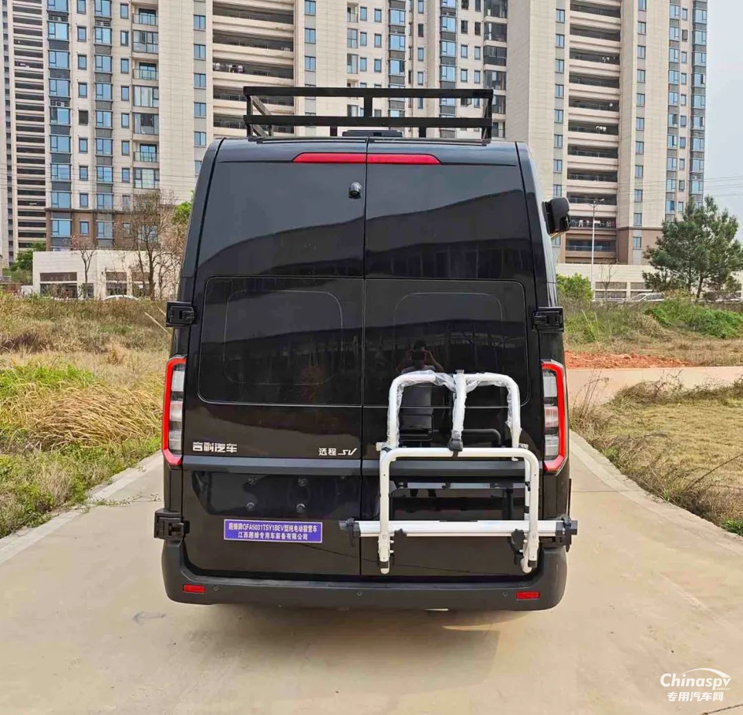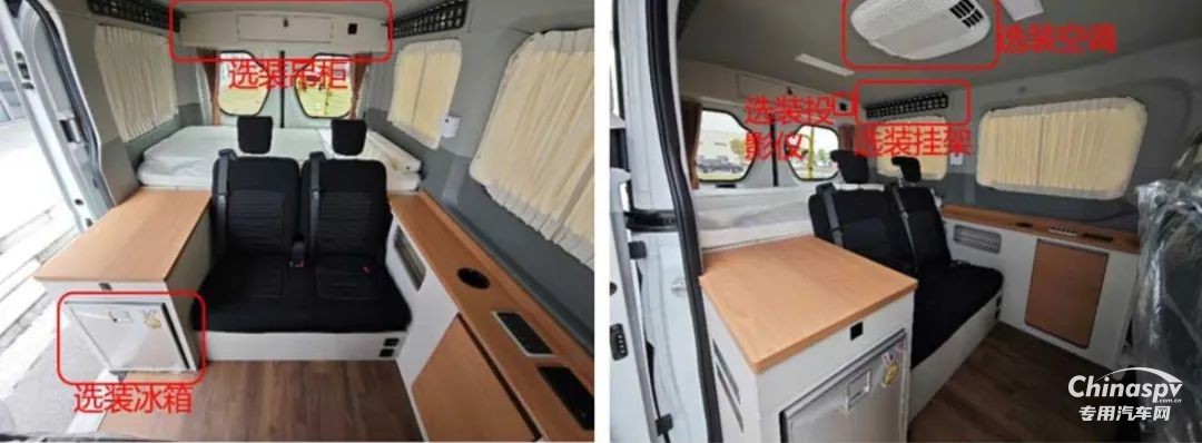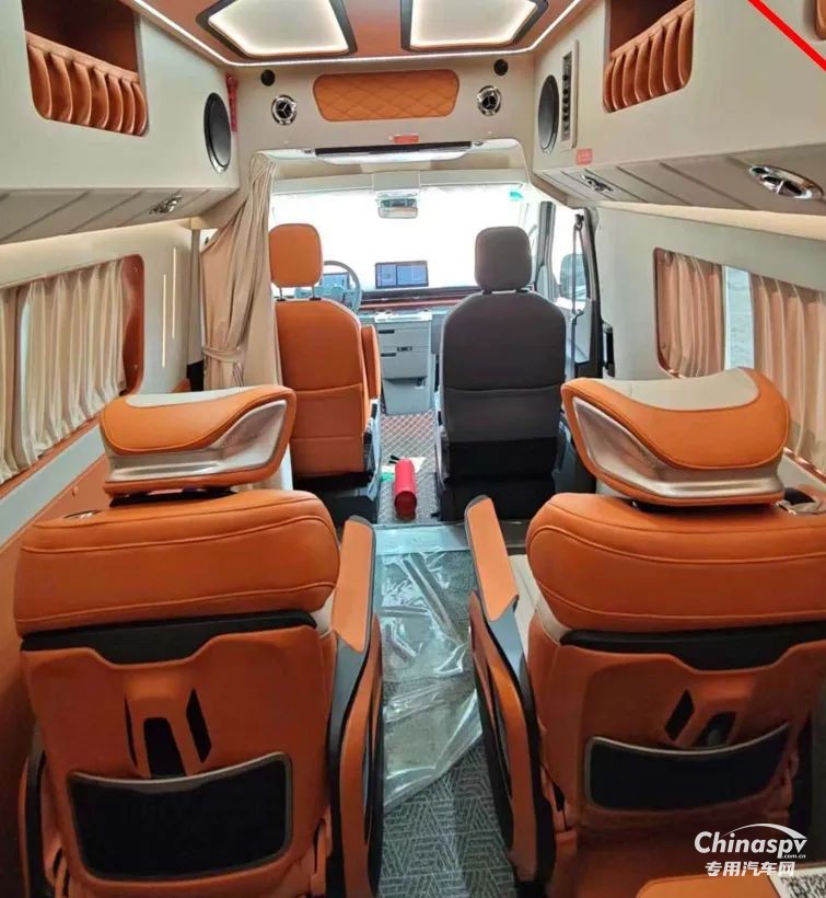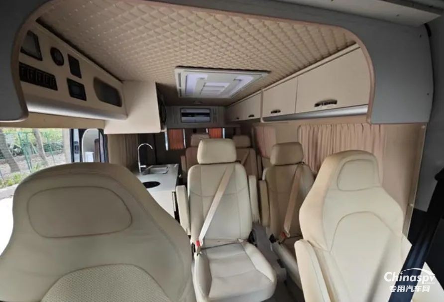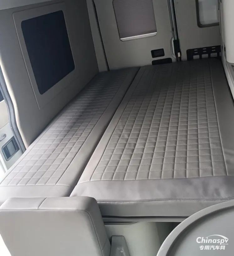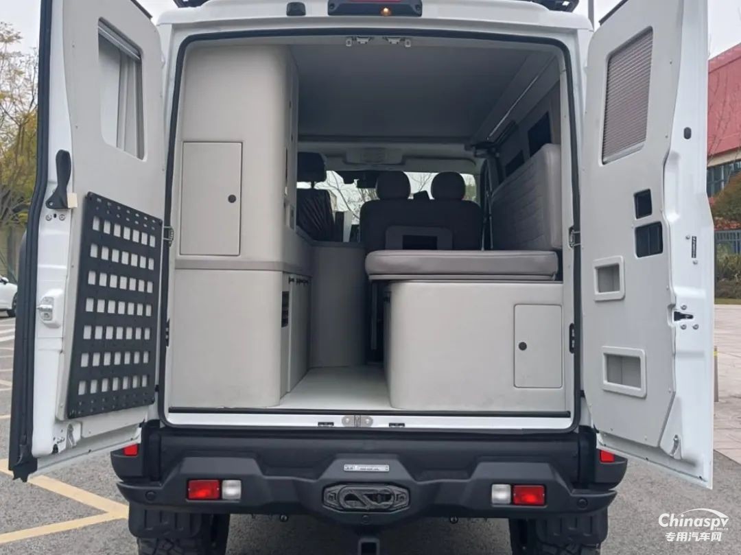 尾部則采用的是一張橫置床鋪,下方預(yù)留有儲(chǔ)物空間,個(gè)人猜測(cè)床板掀起后下方空間還可以作為簡(jiǎn)單淋浴使用,除此以外也可以看到車(chē)內(nèi)加裝了吊柜、空調(diào)、內(nèi)飾軟包等設(shè)施。