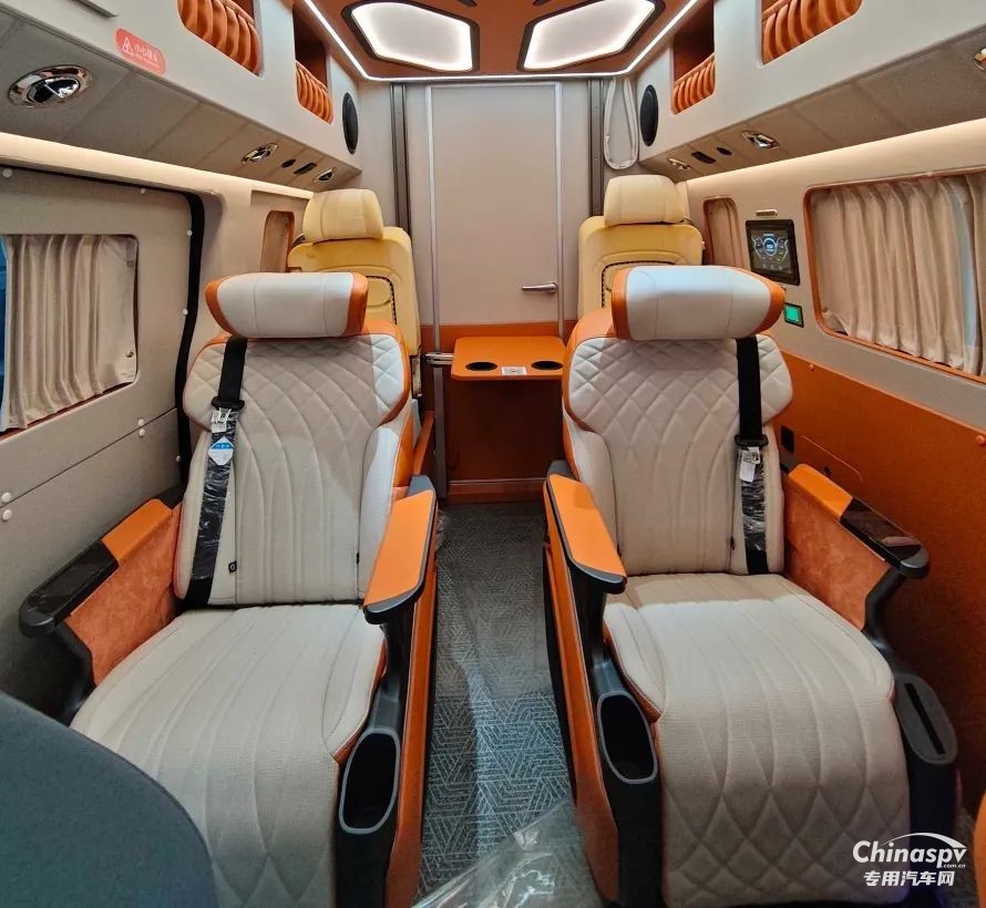 生活區(qū)的設(shè)計(jì)則偏商務(wù)使用,其中前方區(qū)域采用6座布局,第二排采用了兩張獨(dú)立航空座椅,加上車(chē)內(nèi)大量皮質(zhì)軟包以及氛圍燈裝飾,作為商用車(chē)使用也沒(méi)問(wèn)題,生活區(qū)頂部還提供了一張電動(dòng)吊床。