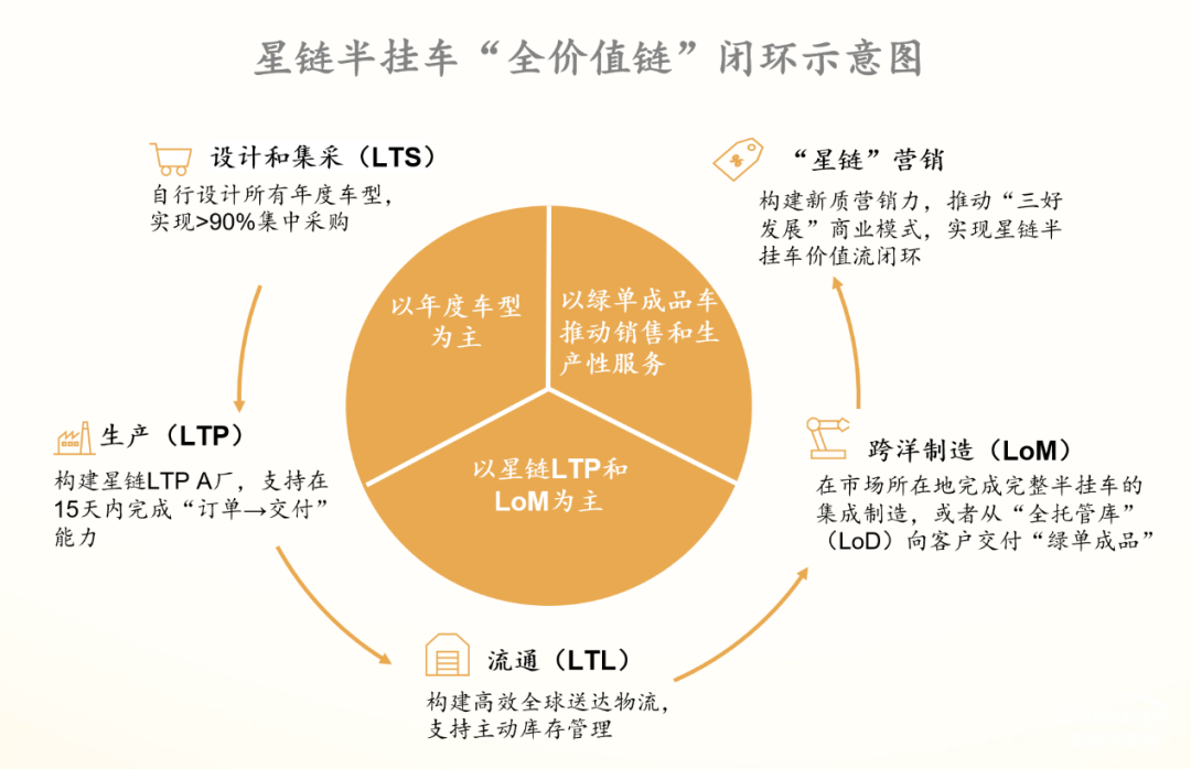 值得一提的是,為應(yīng)對(duì)全球地緣政治的各種漩渦,并提升長遠(yuǎn)的競爭力,中集車輛有五大核心舉措,其中全球半掛車以“星鏈計(jì)劃”和“雄起計(jì)劃”為抓手,深度挖掘全價(jià)值鏈各個(gè)環(huán)節(jié)的價(jià)值是首要舉措。“星鏈計(jì)劃”精心定義半掛車業(yè)務(wù)全價(jià)值鏈的五個(gè)核心環(huán)節(jié),推動(dòng)公司實(shí)現(xiàn)星鏈半掛車“全價(jià)值鏈”的價(jià)值流閉環(huán)。