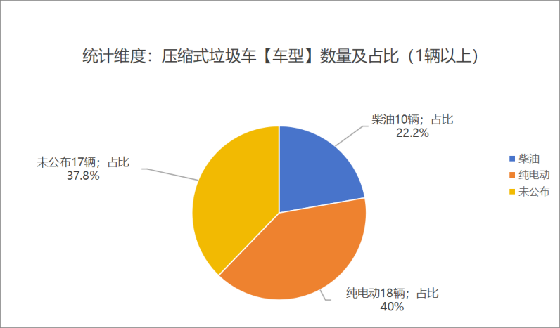 本次公告中的45款垃圾車中,柴油(10輛,占比22.2%)、純電動(18輛,占比40%)、未公布相關數(shù)據(jù)(17輛,占比37.8%)。