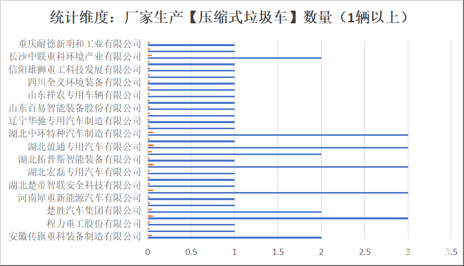 未公布數(shù)據(jù)的垃圾車企業(yè)以及數(shù)量如下:湖北盈通專用汽車有限公司(3輛)、楚勝汽車集團有限公司(1輛)、中氫寰宇新能源河北有限公司(1輛)、湖北博利特種汽車裝備股份有限公司(1輛)、安徽傳旗重科裝備制造有限公司(1輛)、湖北恒晟達汽車有限公司(1輛)、重慶耐德新明和工業(yè)有限公司(1輛)、湖北中環(huán)特種汽車制造有限公司(1輛)、程力專用汽車股份有限公司(1輛)、湖北永強專用汽車有限公司(1輛)、湖北新盛環(huán)衛(wèi)科技有限公司(1輛)、湖北宏磊專用汽車有限公司(1輛)、湖北瑞力汽車有限公司(1輛)、廣州市環(huán)境衛(wèi)生機械設備廠有限公司(1輛)、湖北博利特種汽車裝備股份有限公司(1輛)。
