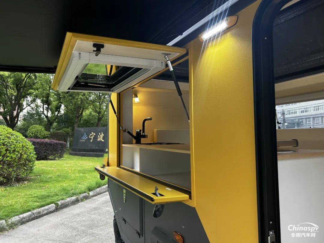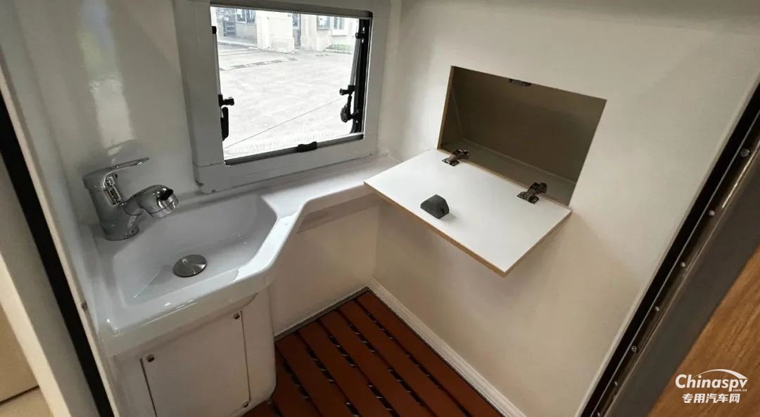 前部功能區(qū)配有空調(diào)、冰箱、集成控制面板、水位顯示器和電動升頂控制開關(guān)。衛(wèi)生間還貼心設(shè)置一暗格,以便洗漱用品存取。