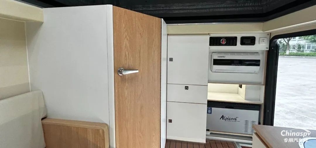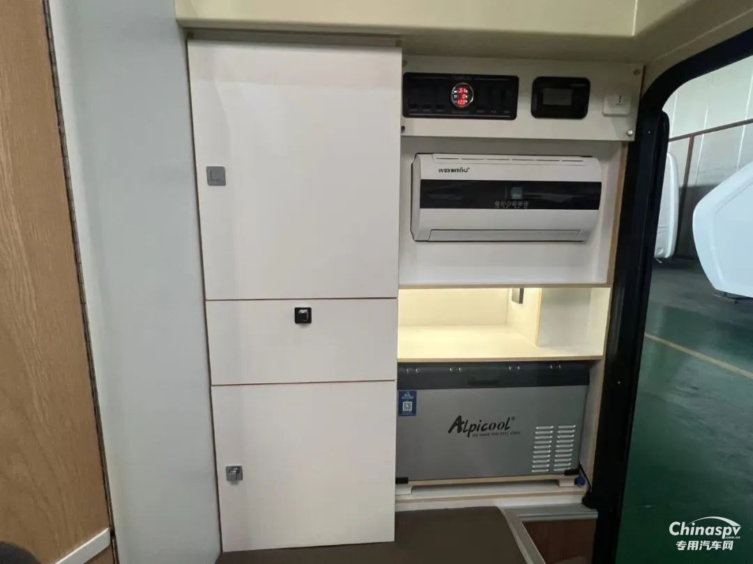 入戶門采用歐式房車專用門,主門與紗門可分離;入口右手邊是含便攜式冰箱、12V房車專用空調(diào)及整車電源控制集成開關(guān)等的立柜。