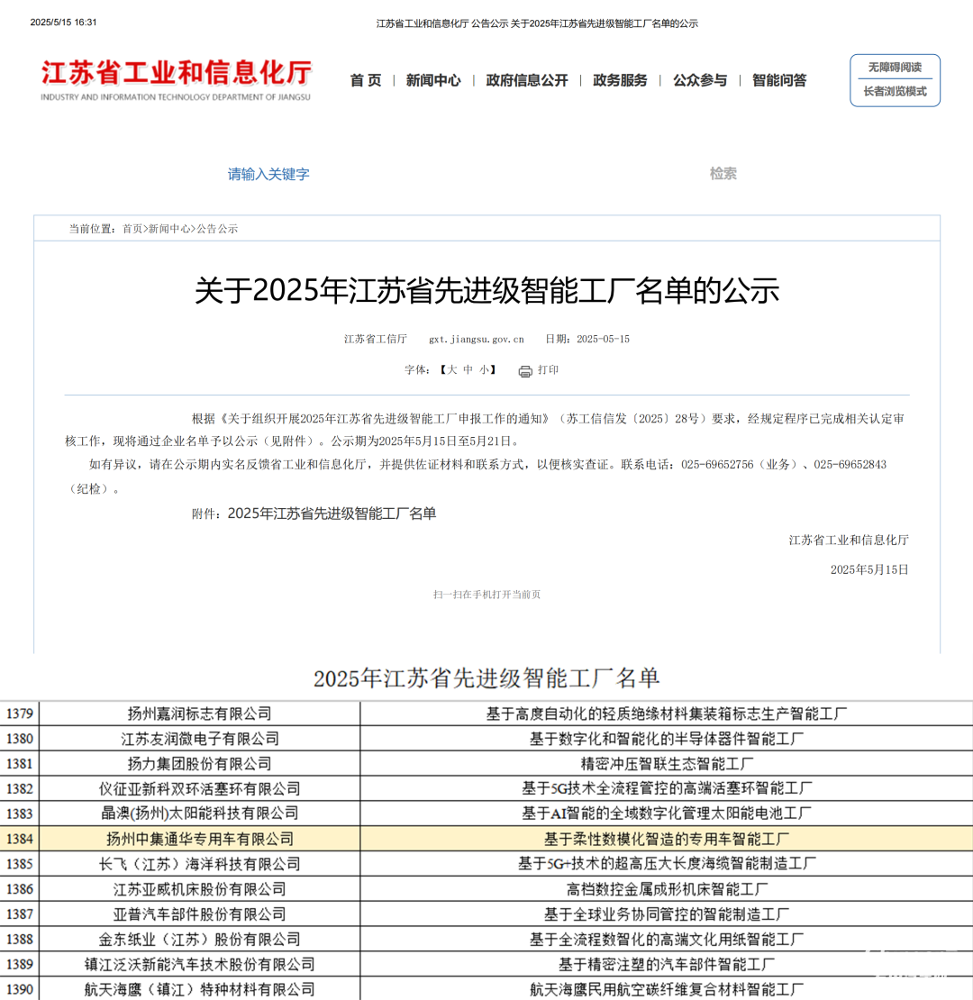 近日,江蘇省工業(yè)和信息化廳正式公布了2025年江蘇省智能工廠(先進級)名單。揚州通華專用車有限公司榮膺“2025年江蘇省先進級智能工廠”稱號。這一榮譽既是對公司在“智改數(shù)轉(zhuǎn)網(wǎng)聯(lián)”戰(zhàn)略下取得成果的高度認(rèn)可,更是對公司積極踐行中集車輛“星鏈計劃”,全面構(gòu)建新質(zhì)生產(chǎn)力,全球輸出新質(zhì)生產(chǎn)力,推動實體經(jīng)濟和數(shù)字經(jīng)濟深度融合的充分肯定。