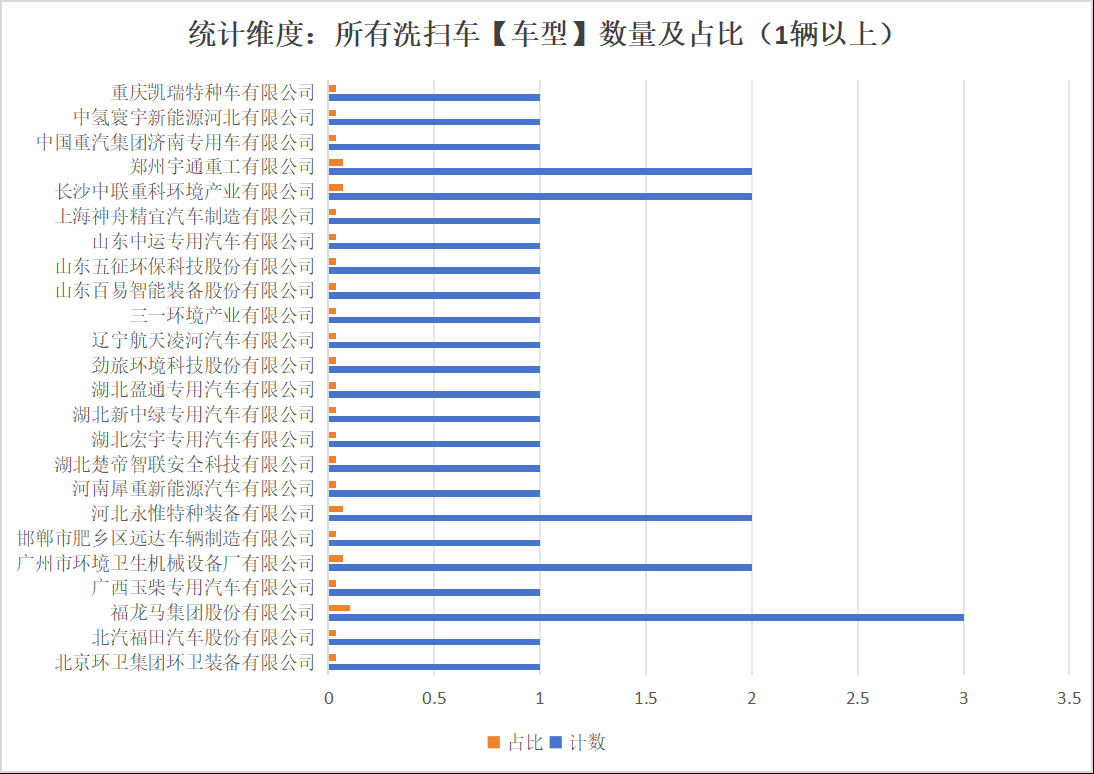 本次公告中的30款洗掃車(chē)的生產(chǎn)企業(yè)共有24家,北京環(huán)衛(wèi)集團(tuán)環(huán)衛(wèi)裝備有限公司(1輛)、北汽福田汽車(chē)股份有限公司(1輛)、福龍馬集團(tuán)股份有限公司(3輛)、廣西玉柴專用汽車(chē)有限公司(1輛)、廣州市環(huán)境衛(wèi)生機(jī)械設(shè)備廠有限公司(2輛)、邯鄲市肥鄉(xiāng)區(qū)遠(yuǎn)達(dá)車(chē)輛制造有限公司(1輛)、河北永惟特種裝備有限公司(2輛)、河南犀重新能源汽車(chē)有限公司(1輛)、湖北楚帝智聯(lián)安全科技有限公司(1輛)、湖北宏宇專用汽車(chē)有限公司(1輛)、湖北新中綠專用汽車(chē)有限公司(1輛)、湖北盈通專用汽車(chē)有限公司(1輛)、勁旅環(huán)境科技股份有限公司(1輛)、遼寧航天凌河汽車(chē)有限公司(1輛)、三一環(huán)境產(chǎn)業(yè)有限公司(1輛)、山東百易智能裝備股份有限公司(1輛)、山東五征環(huán)保科技股份有限公司(1輛)、山東中運(yùn)專用汽車(chē)有限公司(1輛)、上海神舟精宜汽車(chē)制造有限公司(1輛)、長(zhǎng)沙中聯(lián)重科環(huán)境產(chǎn)業(yè)有限公司(2輛)、鄭州宇通重工有限公司(2輛)、中國(guó)重汽集團(tuán)濟(jì)南專用車(chē)有限公司(1輛)、中氫寰宇新能源河北有限公司(1輛)、重慶凱瑞特種車(chē)有限公司(1輛)。