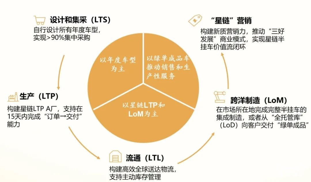 2023年3月,中集車輛啟動(dòng)“星鏈計(jì)劃”,聚焦自身最為核心的半掛車業(yè)務(wù),展開生產(chǎn)組織結(jié)構(gòu)改革,重新定義從設(shè)計(jì)和集采、生產(chǎn)、流通、跨洋制造到營(yíng)銷的全價(jià)值鏈的五個(gè)環(huán)節(jié)。