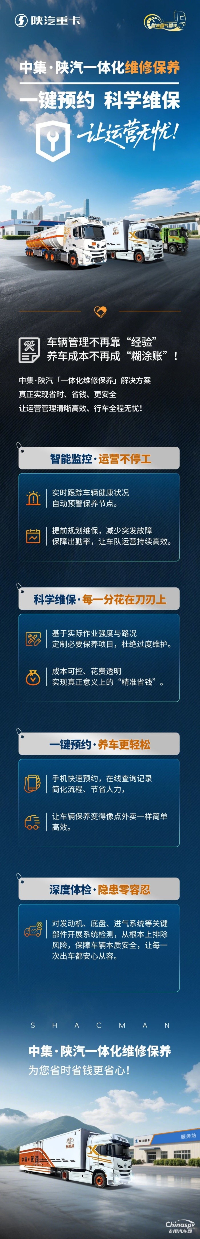 中集·陜汽一體化維修保養(yǎng),一鍵預(yù)約,科學(xué)維保,讓運(yùn)營(yíng)無(wú)憂!