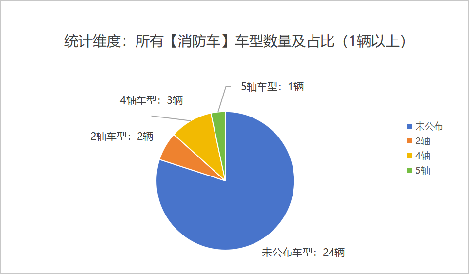 本次公告中的30款消防車中,2軸(2輛,占比6.7%)、4軸(3輛,占比10.0%)、5軸(1輛,占比3.3%)未公布相關(guān)數(shù)據(jù)(24輛,占比80.0%)。
