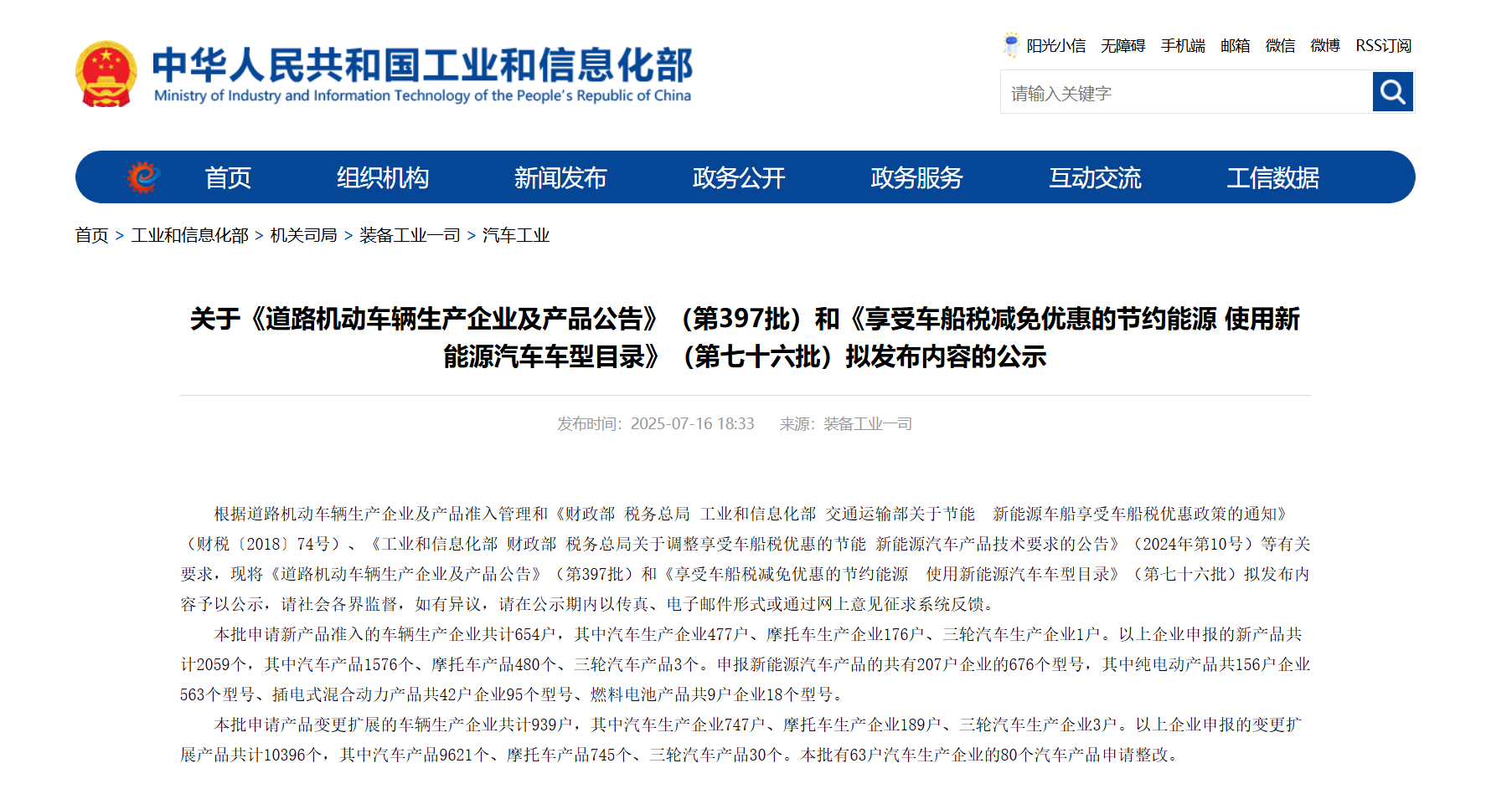 2025年,工業(yè)和信息化部第397批《道路機(jī)動(dòng)車輛生產(chǎn)企業(yè)及產(chǎn)品公告》(下稱《公告》),在官方網(wǎng)站正式公示。本批申請(qǐng)新產(chǎn)品準(zhǔn)入的車輛生產(chǎn)企業(yè)共計(jì)654戶,其中汽車生產(chǎn)企業(yè)477戶、摩托車生產(chǎn)企業(yè)176戶、三輪汽車生產(chǎn)企業(yè)1戶。以上企業(yè)申報(bào)的新產(chǎn)品共計(jì)2059個(gè),其中汽車產(chǎn)品1576個(gè)、摩托車產(chǎn)品480個(gè)、三輪汽車產(chǎn)品3個(gè)。申報(bào)新能源汽車產(chǎn)品的共有207戶企業(yè)的676個(gè)型號(hào),其中純電動(dòng)產(chǎn)品共156戶企業(yè)563個(gè)型號(hào)、插電式混合動(dòng)力產(chǎn)品共42戶企業(yè)95個(gè)型號(hào)、燃料電池產(chǎn)品共9戶企業(yè)18個(gè)型號(hào)。