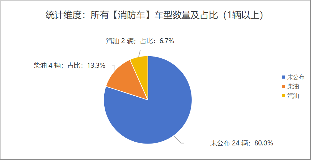 本次公告中的30款消防車中,柴油(4輛,占比13.3%)、汽油(2輛,占比6.7%)、未公布相關(guān)數(shù)據(jù)(24輛,占比80.0%)。